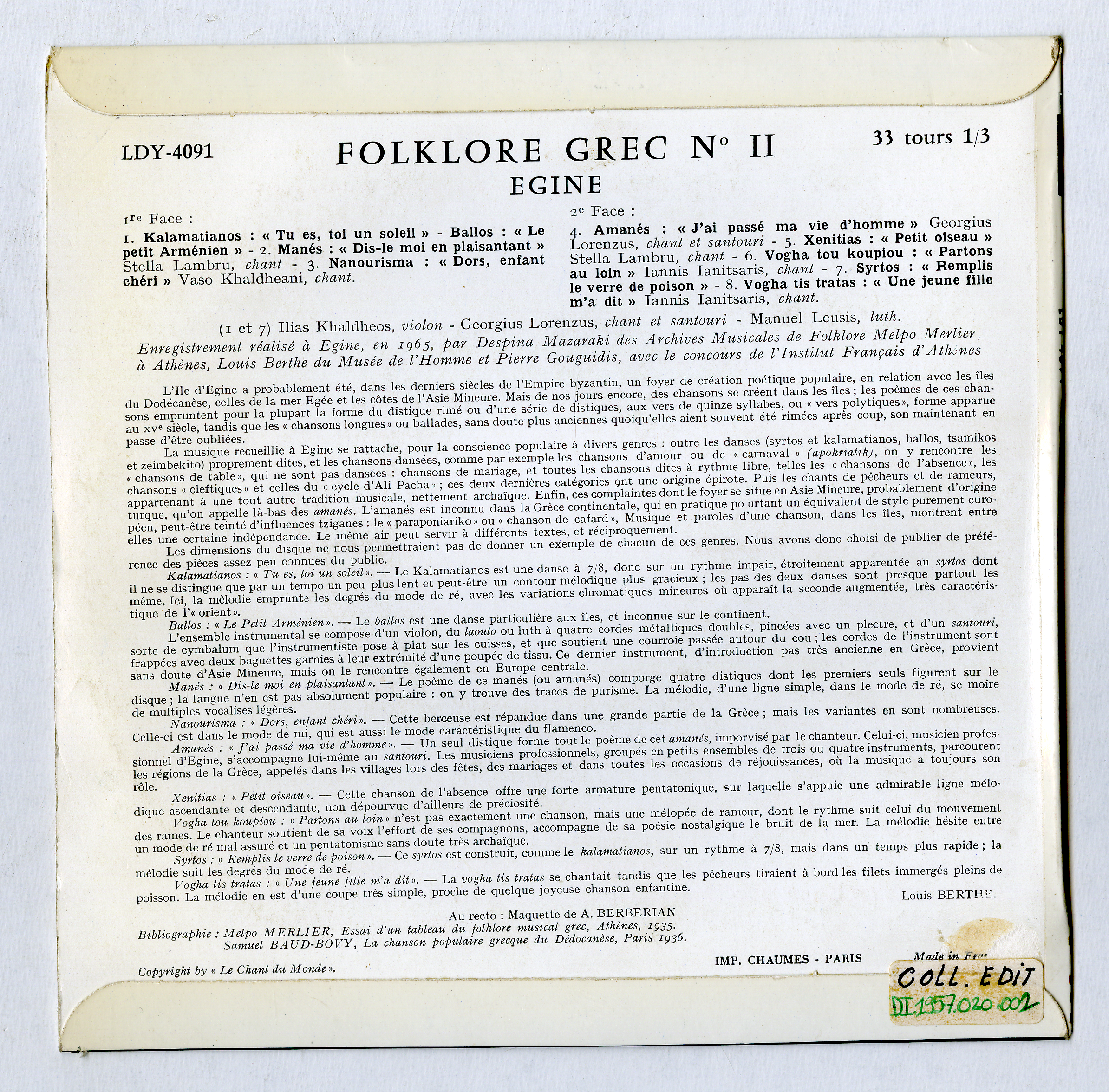 - Avec le concours de l'Institut Français d'Athènes et des Archives Musicales de Folklore Melpo Merier