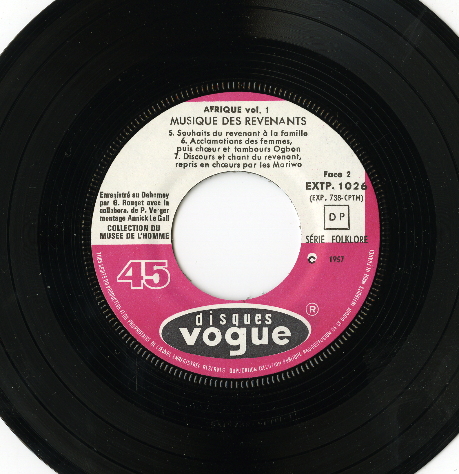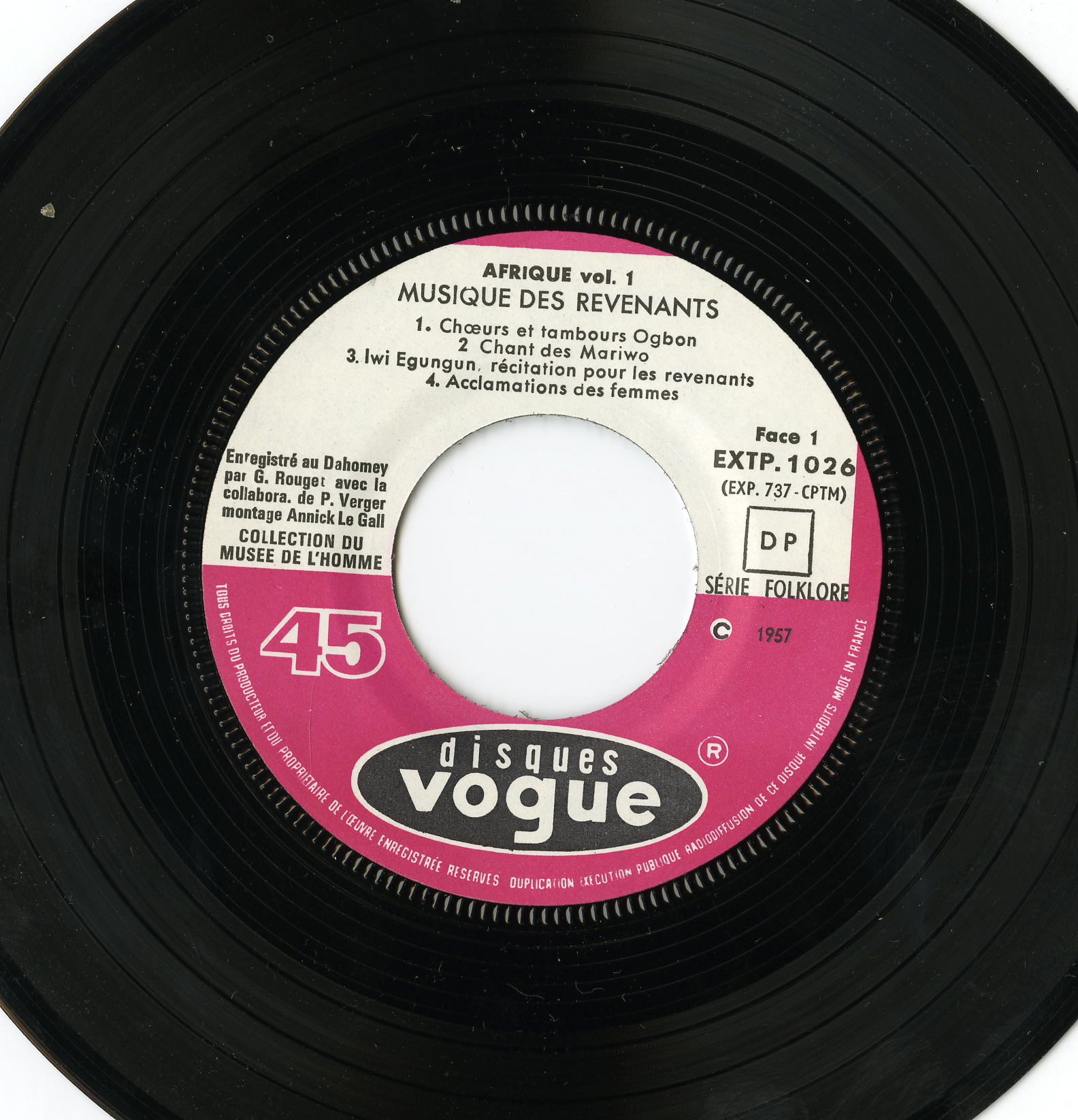 - Mention sur le disque : "Enregistré au Dahomey par G. Rouget avec la collabora. de P. Verger, montage Annick Le Gall. Collection du Musée de l'Homme. Série Folklore"