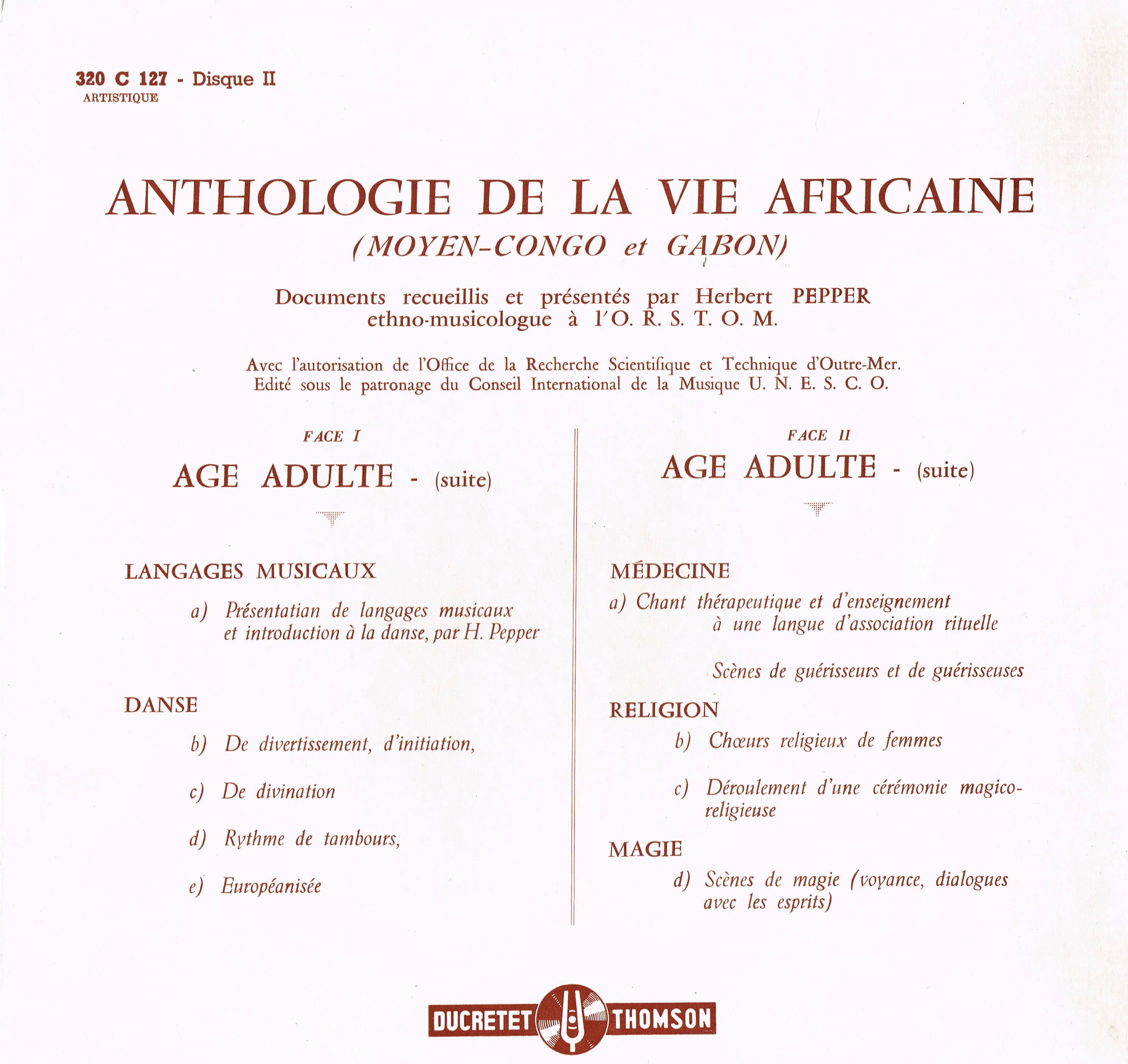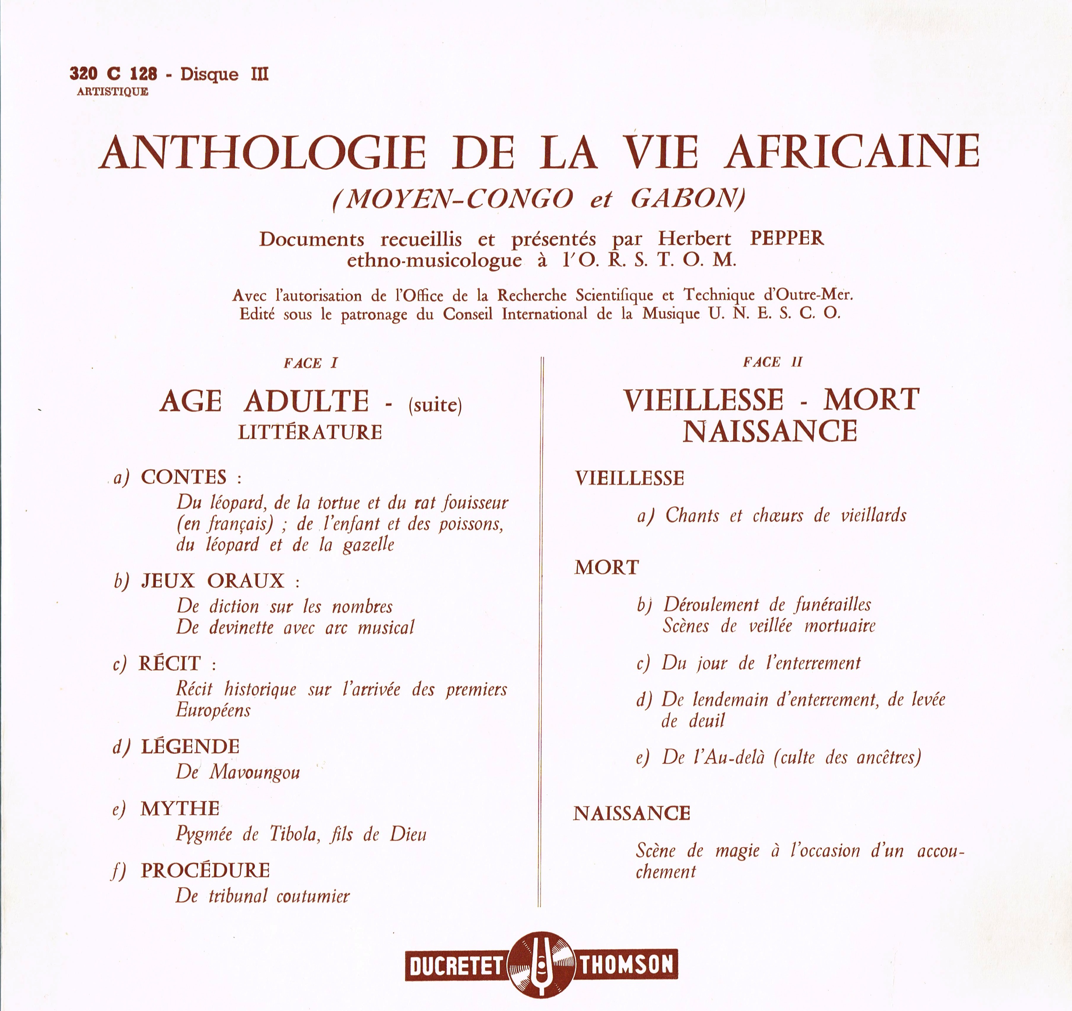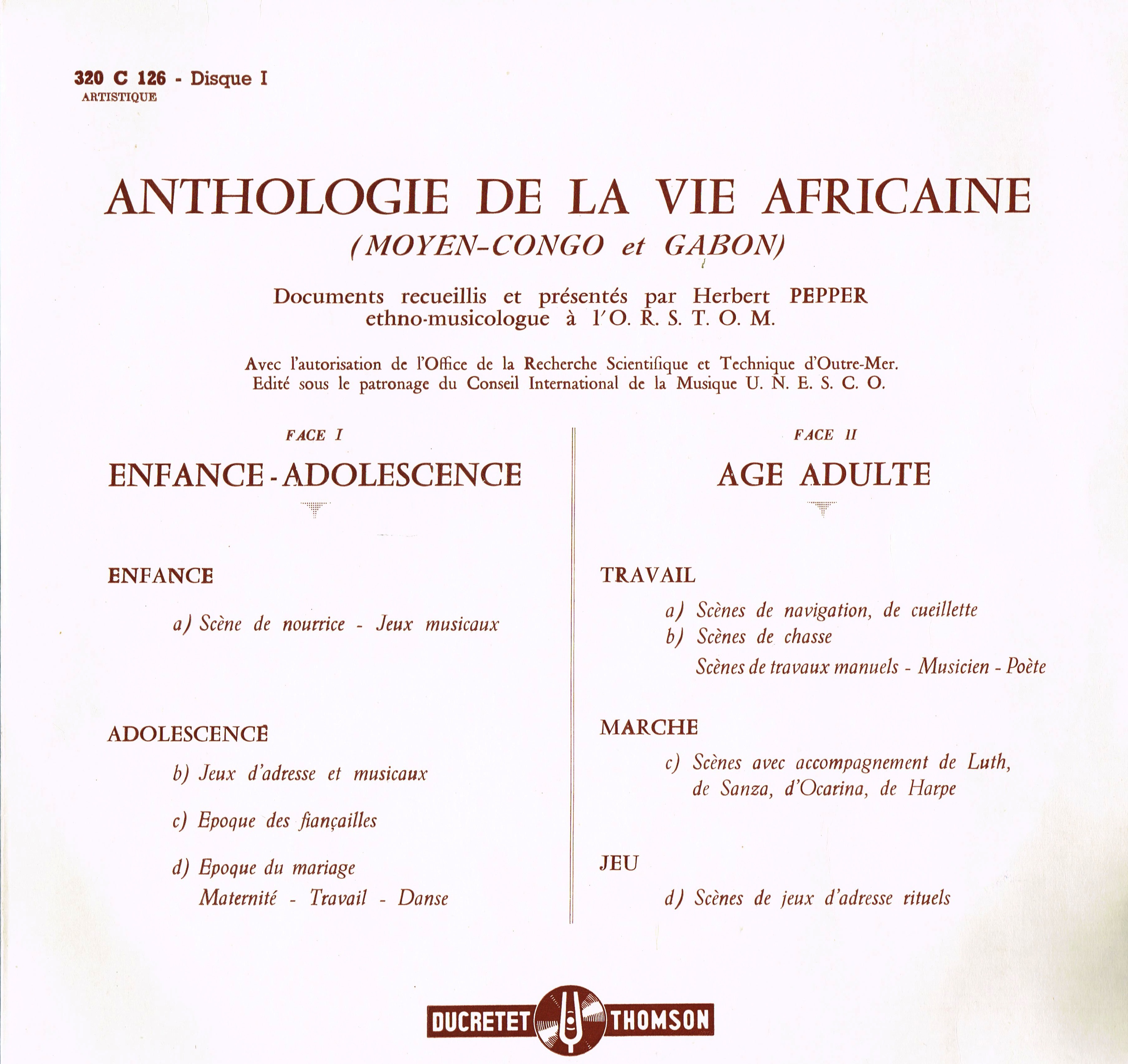 - Enregistrements sonores sur la vie africaine collectés au Congo et Gabon entre 1941 et 1956 (à confirmer) et édités en 1958 sous la forme d'un coffret de 3 disques 33 tours par Herbert Pepper, ethnomusicologue à l'ORSTOM.