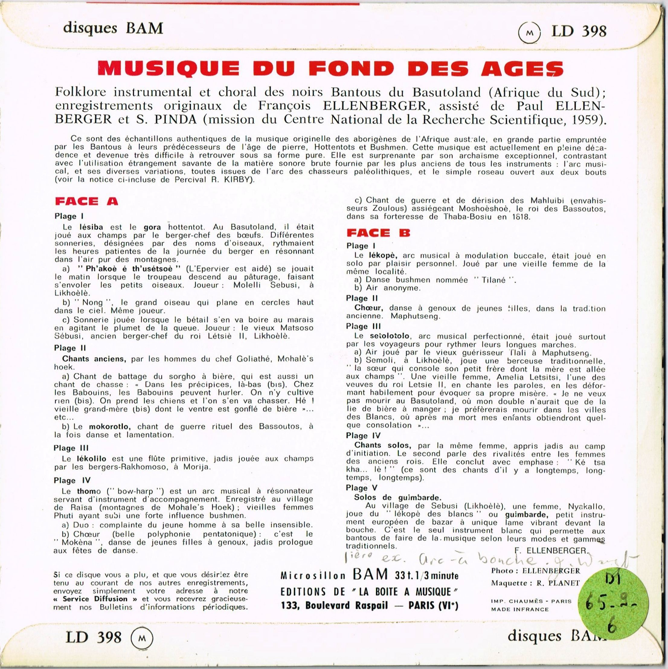- Enregistrements sonores édités de François Ellenberger sur le folklore instrumental et choral des Bantous du Basutoland (Afrique du Sud)