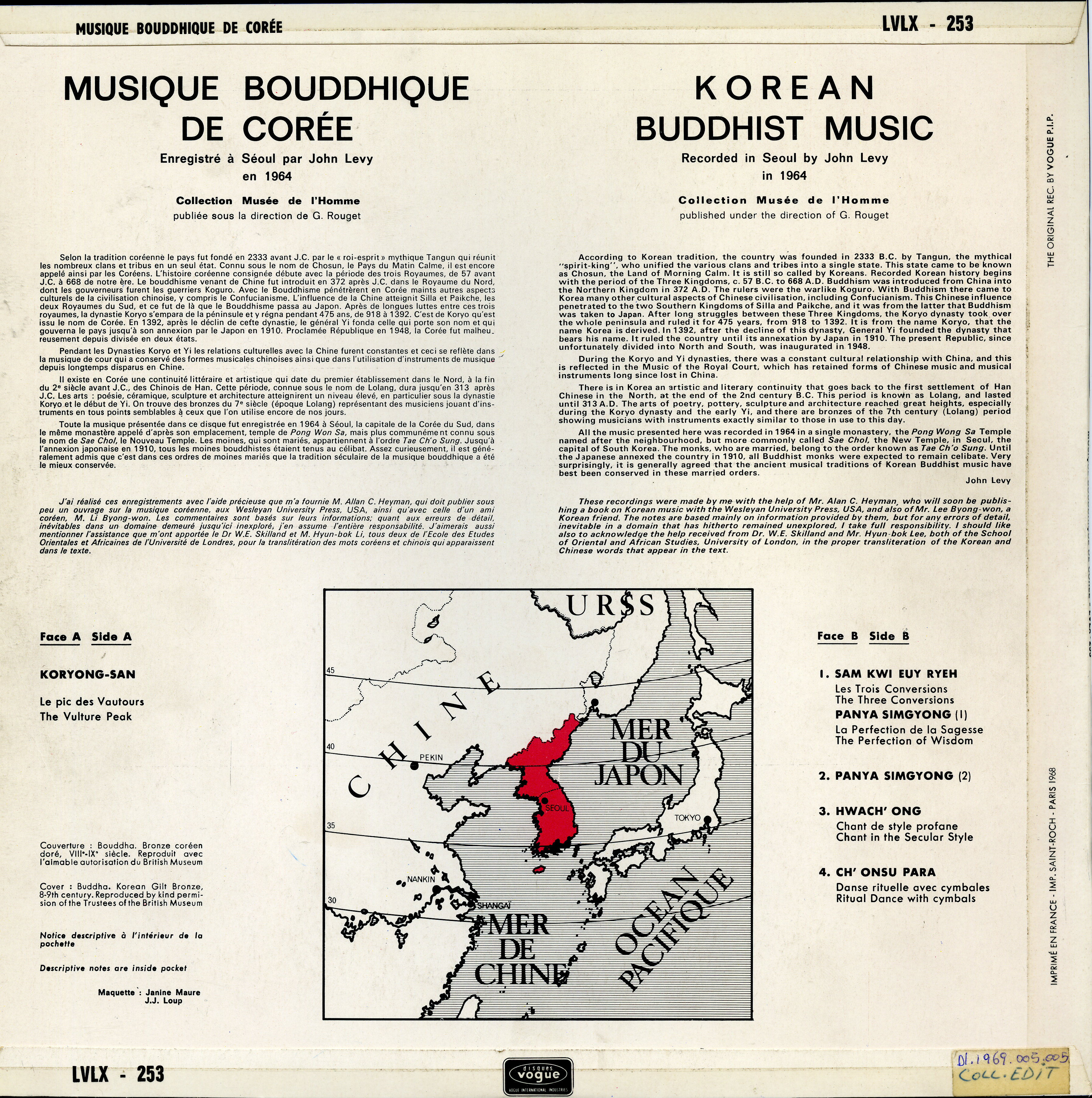 - Enregistrements sonores édités de John Levy sur la musique Bouddhique de Corée lors d'u terrain en 1964.