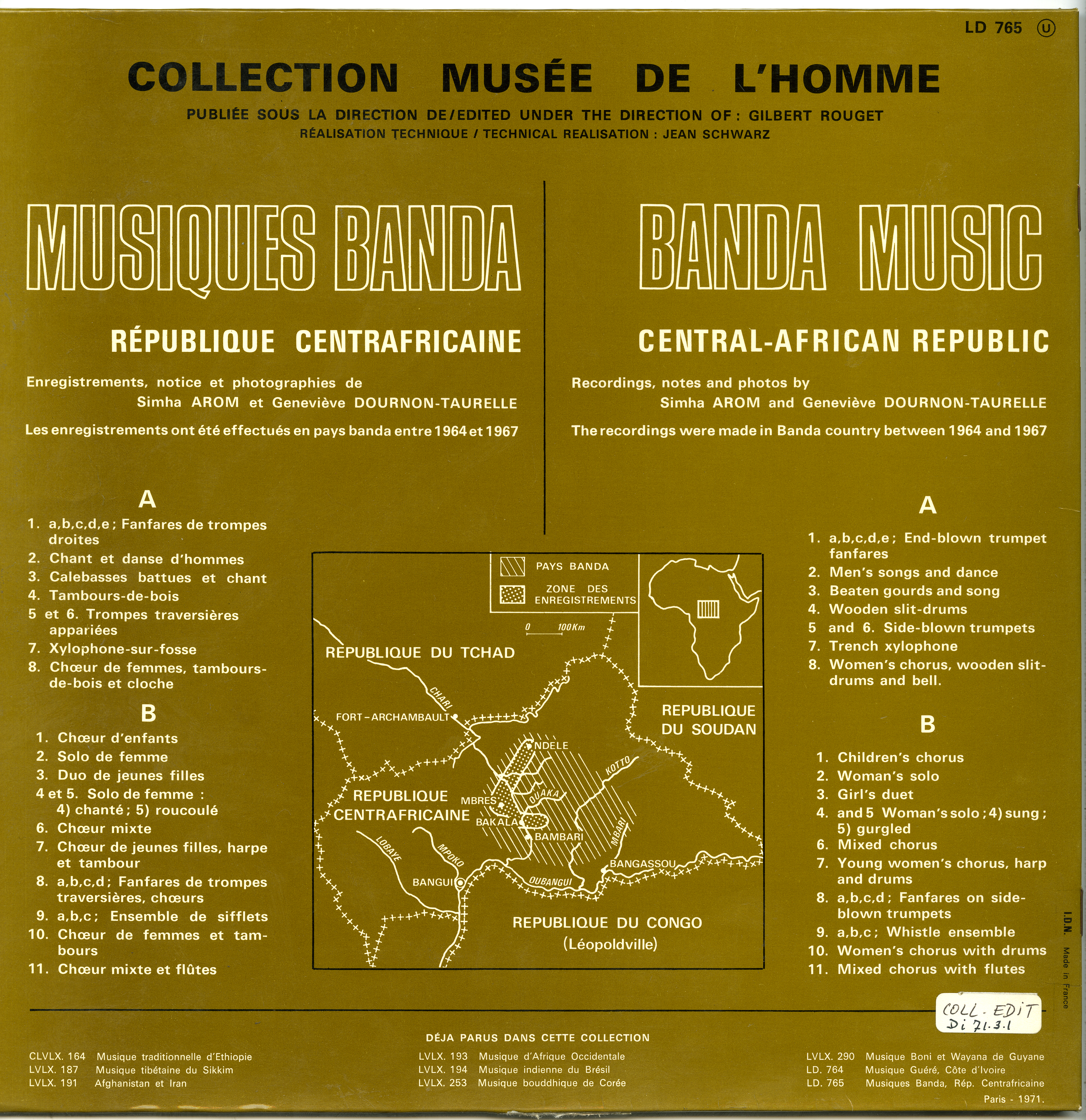 - Enregistrements sonores édités de Simha Arom et Geneviève Dournon sur la musique Banda en république centrafricaine en 1964