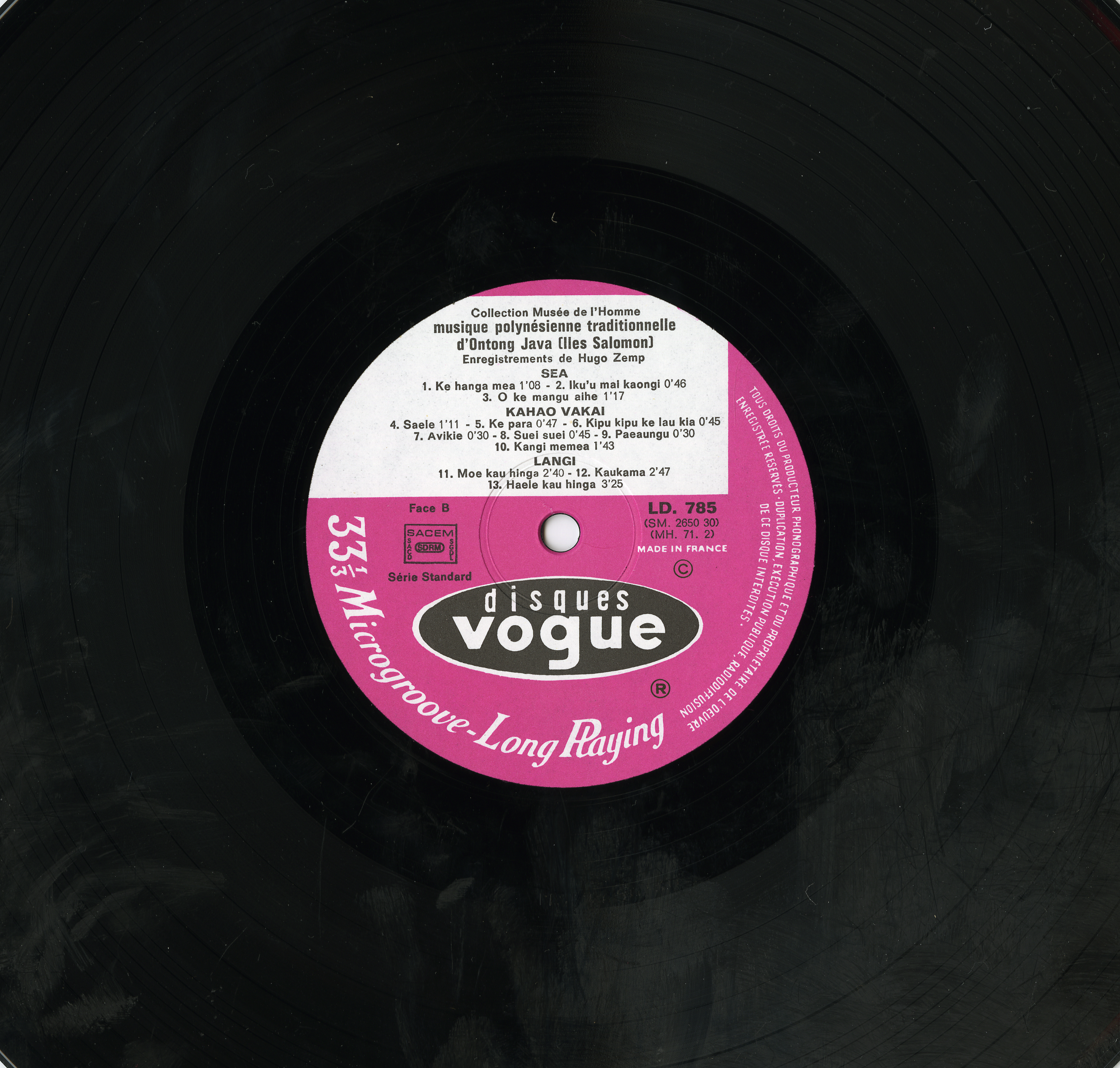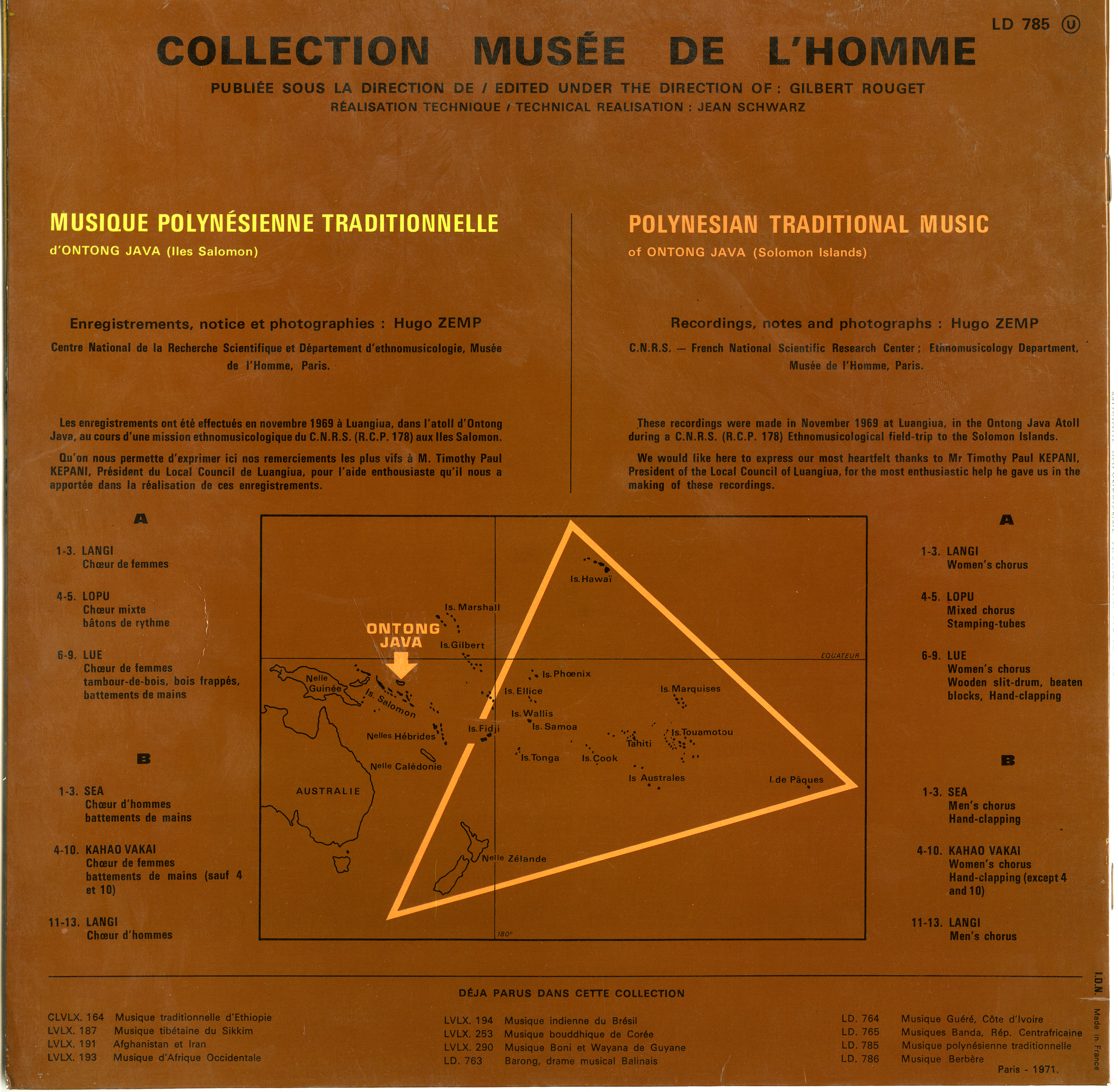 - Enregistrements sonores édités d'Hugo Zemp sur la musique polynésienne traditionnelle d'Ontong Java en 1969