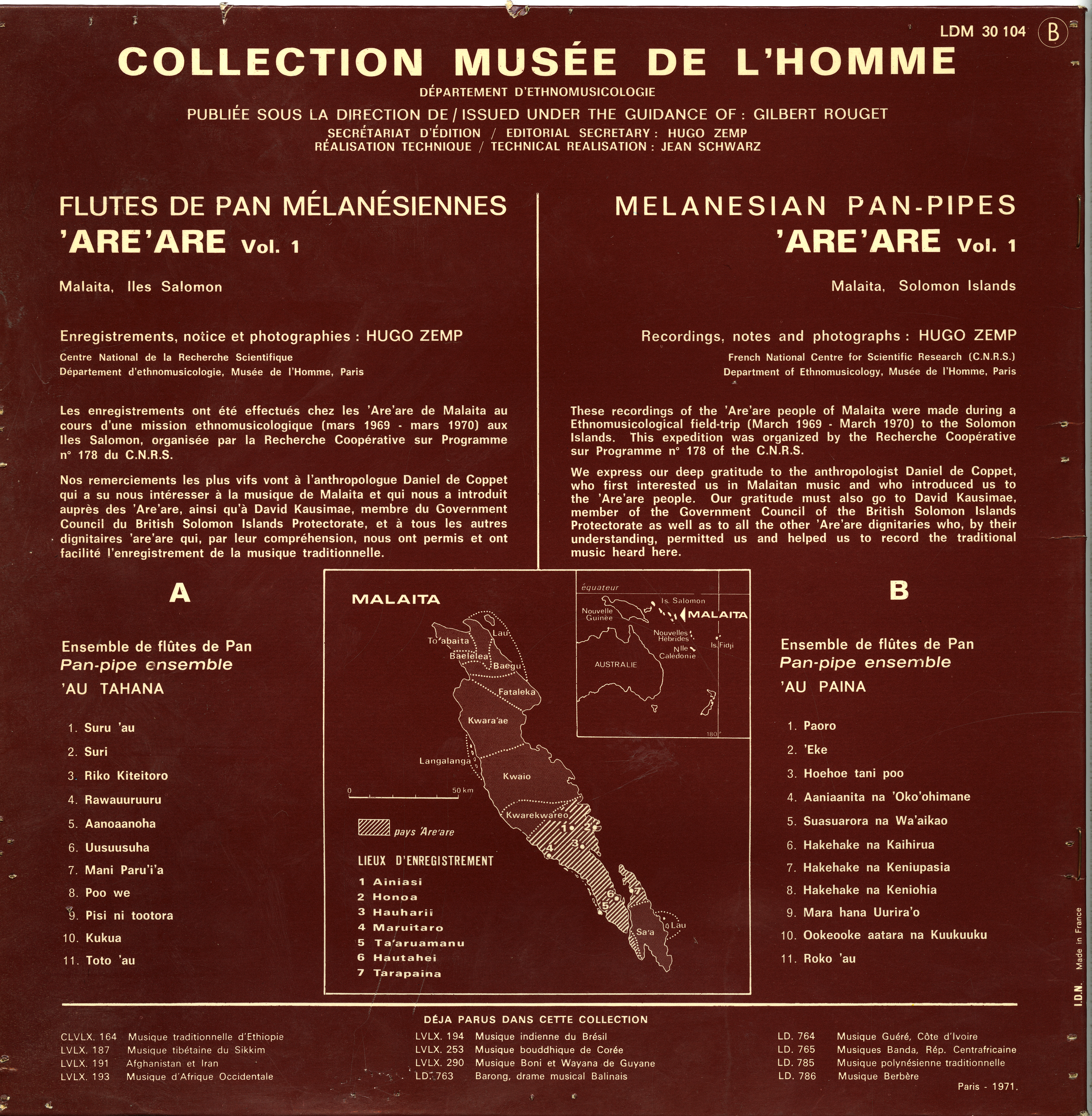 - Enregistrements sonores édités de Hugo Zemp sur la musique des flûtes de pan mélanésiennes are are lors d'un terrain en 1969