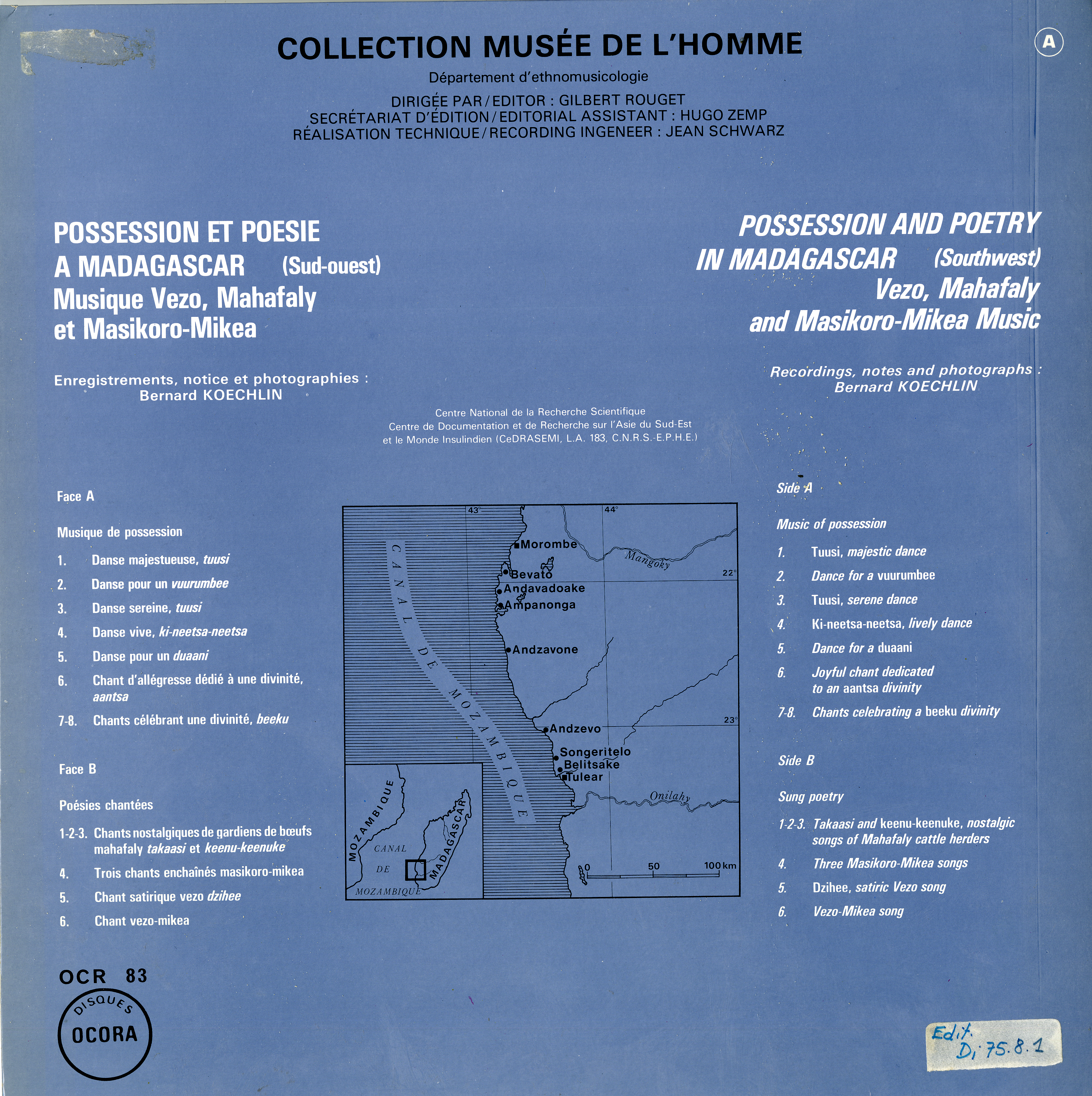 - Enregistrements sonores édités de Bernard Koechlin sur la possession et la poésie dans le Sud-Ouest de Madagascar en 1967