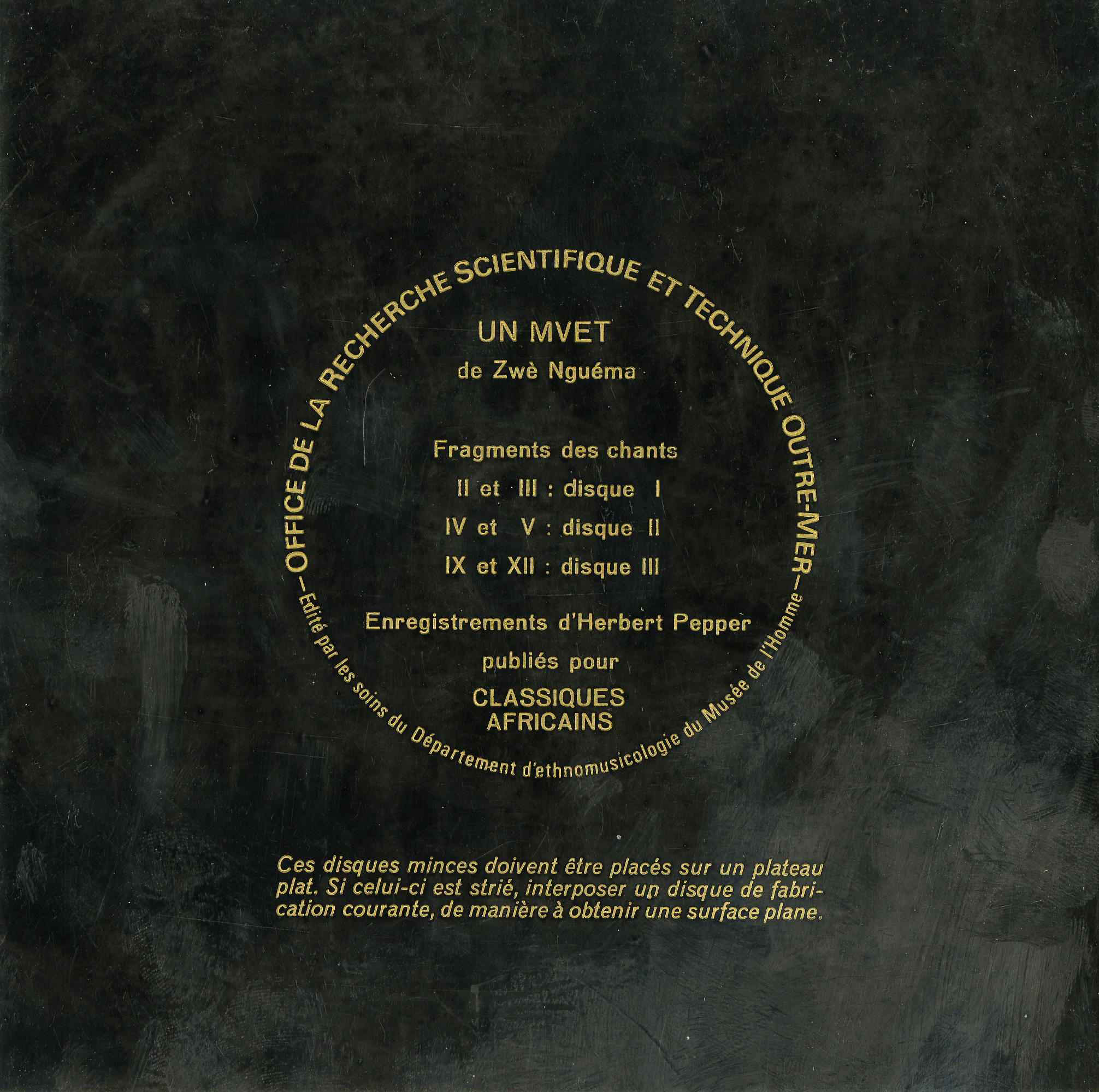 - 3 disques souples accompagnant l'ouvrage "Un Mvet de Zwe Nguema-Chant épique Fang ".