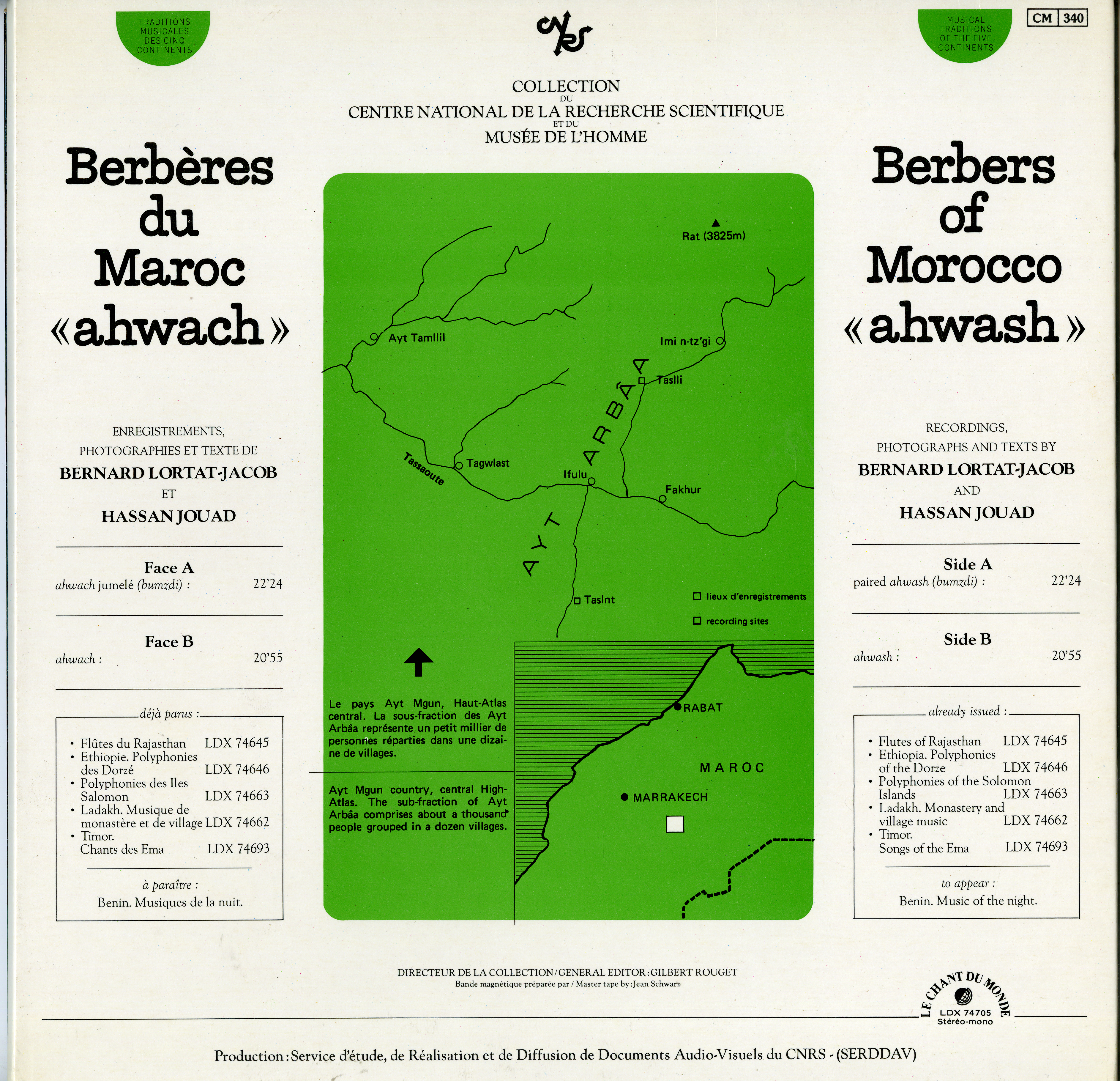 - Enregistrements sonores édités de Bernard Lortat-Jacob et Hassan Jouad sur les Berbères du Maroc "Ahwach" lors d'un terrain entre 1972 et 1975