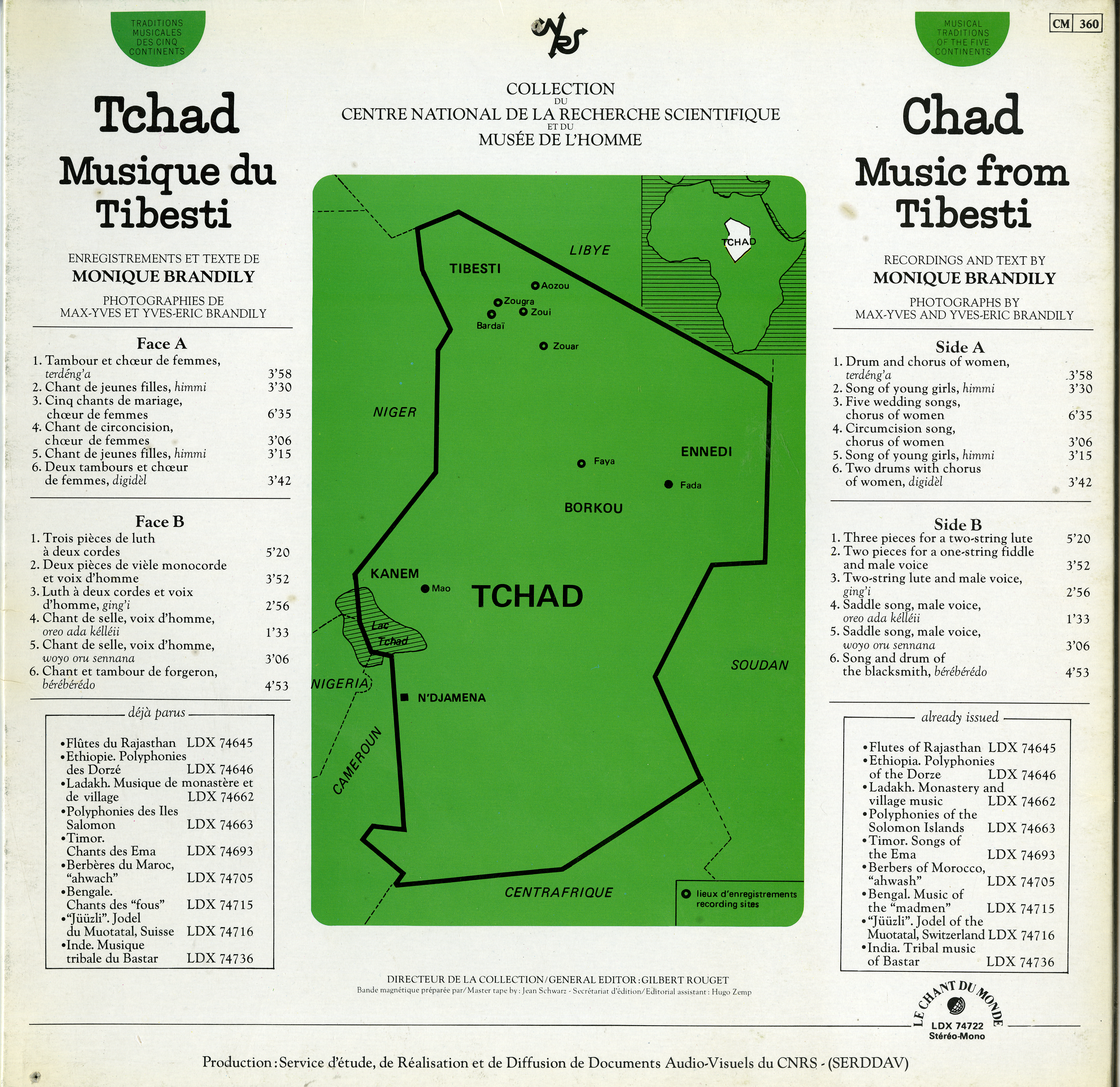 - Enregistrements sonores édités de Monique Brandily sur la musique du Tibesti au Tchad lors d'un terrain en 1961