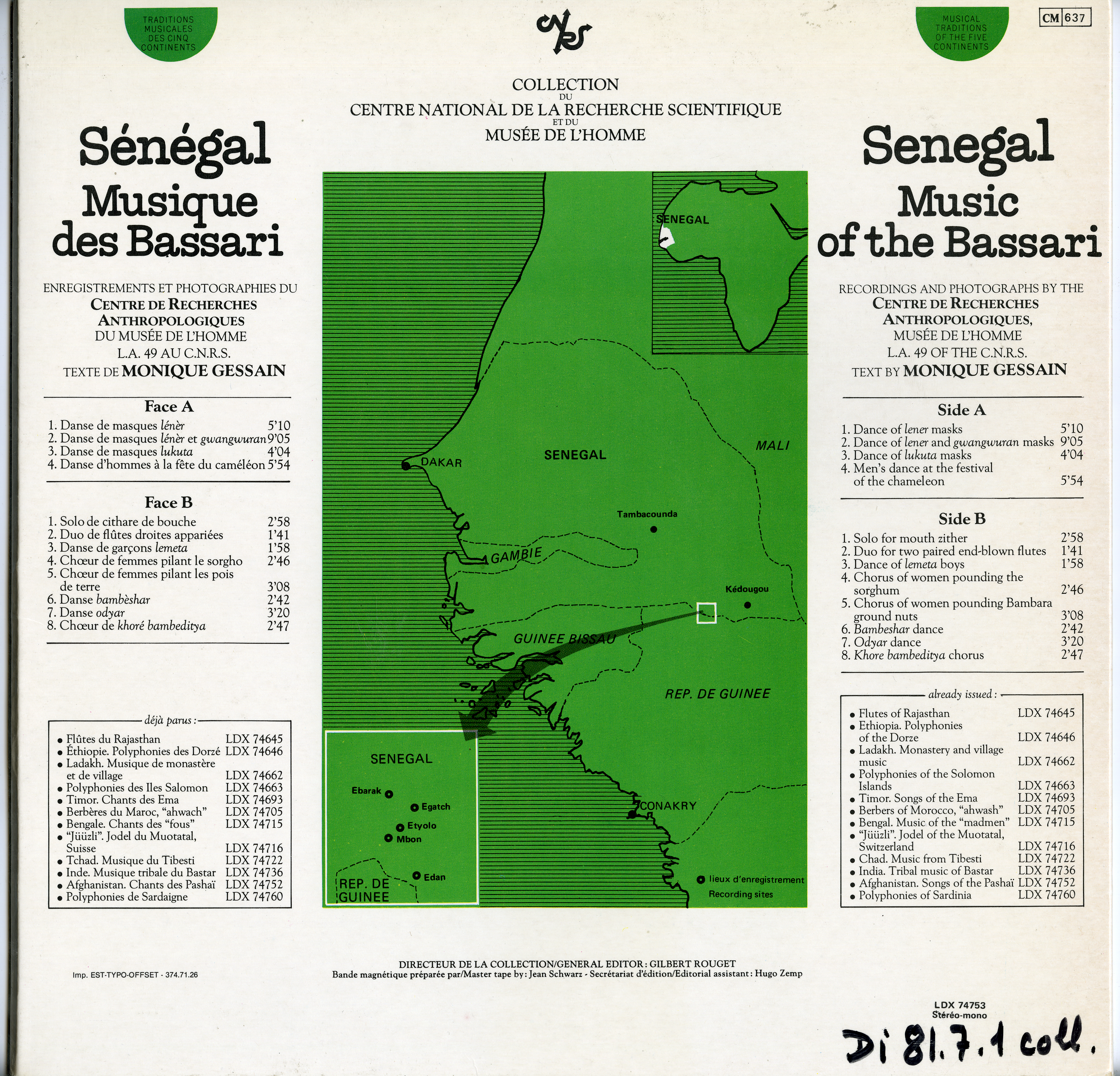 - Enregistrements sonores édités de Monique Gessain sur la musique des Bassari au Sénégal lors d'un terrain en 1961