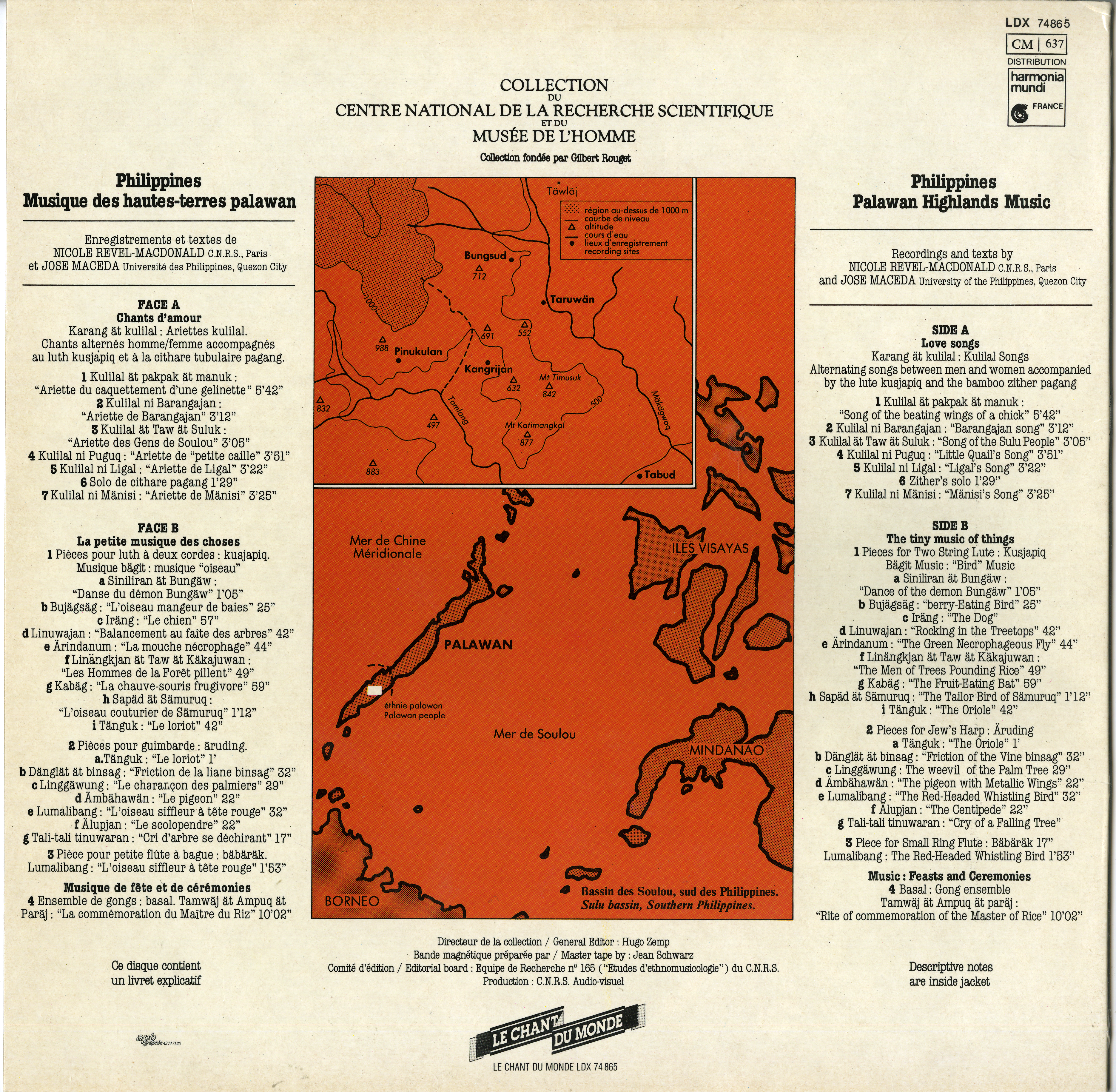- Livret : 8p. français/anglais; Photos ; Dessins ; Transcriptions musicales ; Carte ; Doc.