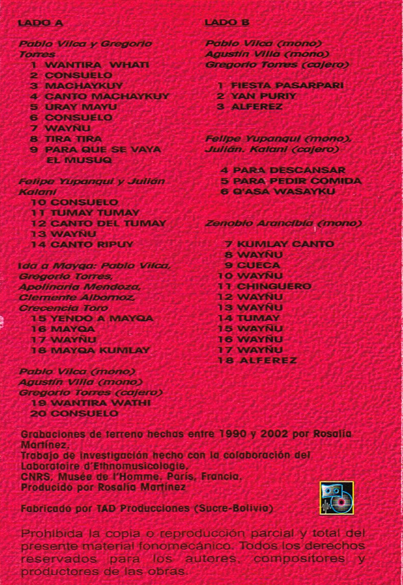 Collaborateur : Proyecto de Rescate y Difusión Cultural Indígena. Texte en espagnol, chants en quechua avec traduction en anglais, glossaire des termes quechua. Texte de Rosalia Martínez, recherche : Rosalía Martínez, avec la collaboration de Juan Arancibia.