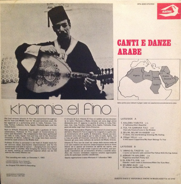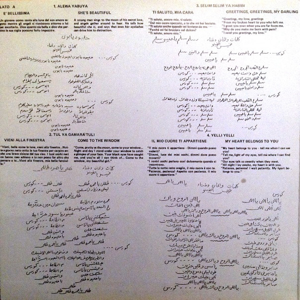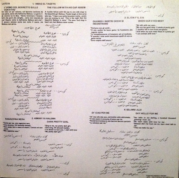 A1 - Halewa Yabuya (3:15) | A2 - Tul Ya Gamara Tuli (4:00) | A3 - Selim, Selim Ya Habibi (4:09) | A4 - Yelli Yelli (5:33) | B1 - 'Awag El Tageya (3:53) | B2 - Asmar Ya Halewa (3:34) | B3 - El Ein F'Il Ein (5:02) | B4 - Selimni Alei (3:38). - Recording context