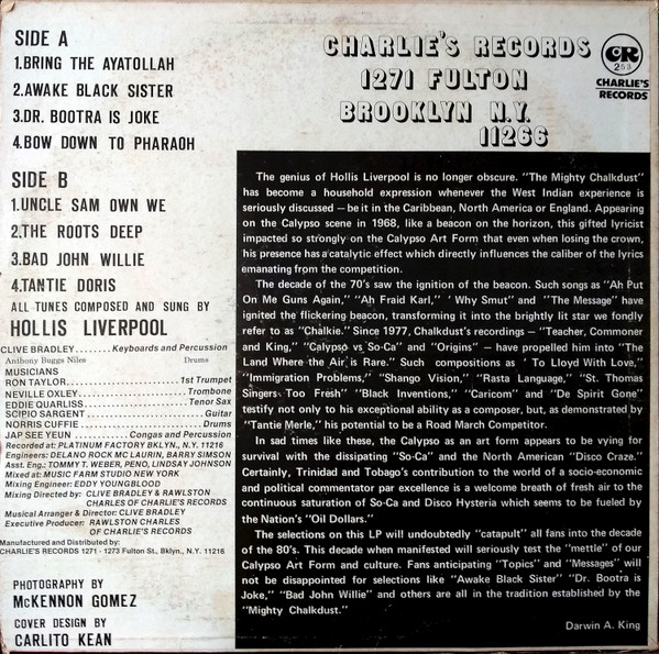 - Musique calypso, album “The Flip Side Of Chalkie” interprété par Chalkdust, enregistré au The Platnum Factory, USA, paru en 1980. [Copie de disques 33 tours de la collection privée de Rémi Joigneaux]