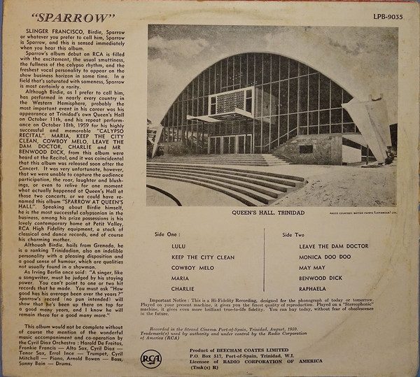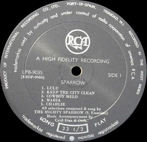 - Musique calypso, album “Sparrow” interprété par Mighty Sparrow, enregistré au The Strand Cinema, Trinidad, paru en 1959. [Copie de disques 33 tours de la collection privée de Rémi Joigneaux]