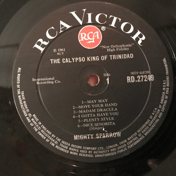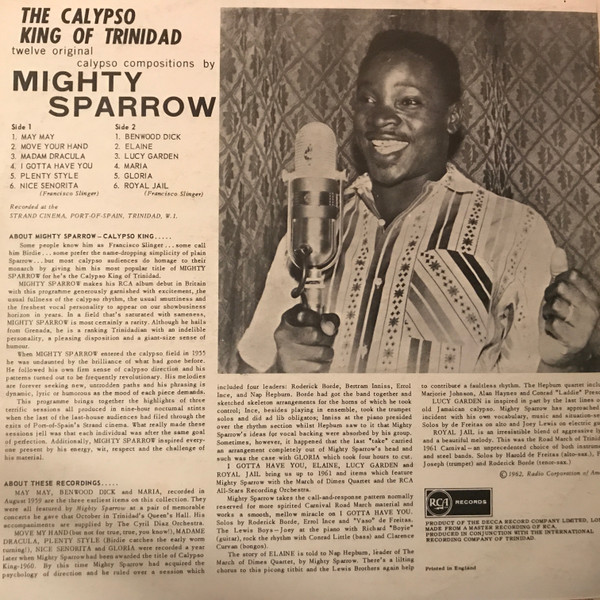 - Musique calypso, album “Calypso King Of Trinidad” interprété par Mighty Sparrow, enregistré au The Strand Cinema, Trinidad, paru en 1962. [Copie de disques 33 tours de la collection privée de Rémi Joigneaux]