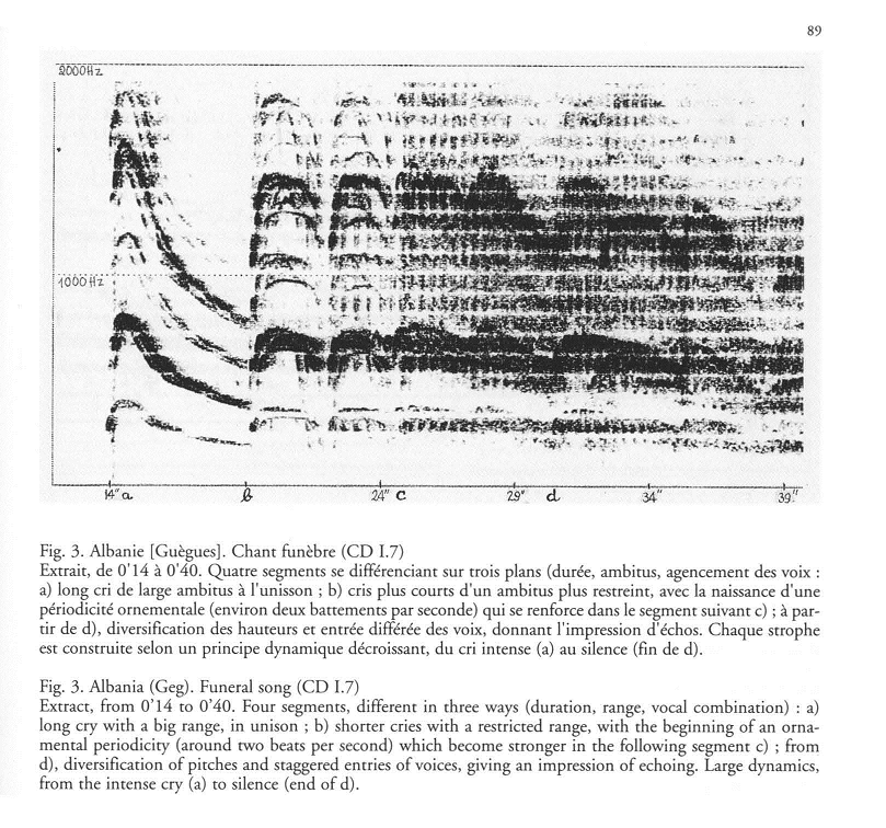 Collective clamouring, organised according to a strict strophic plan : regular alternance of the chant, properly speaking (homophonic), with its "clamourous echoing" by the voices of the choir. See the sonagram, figure 3.