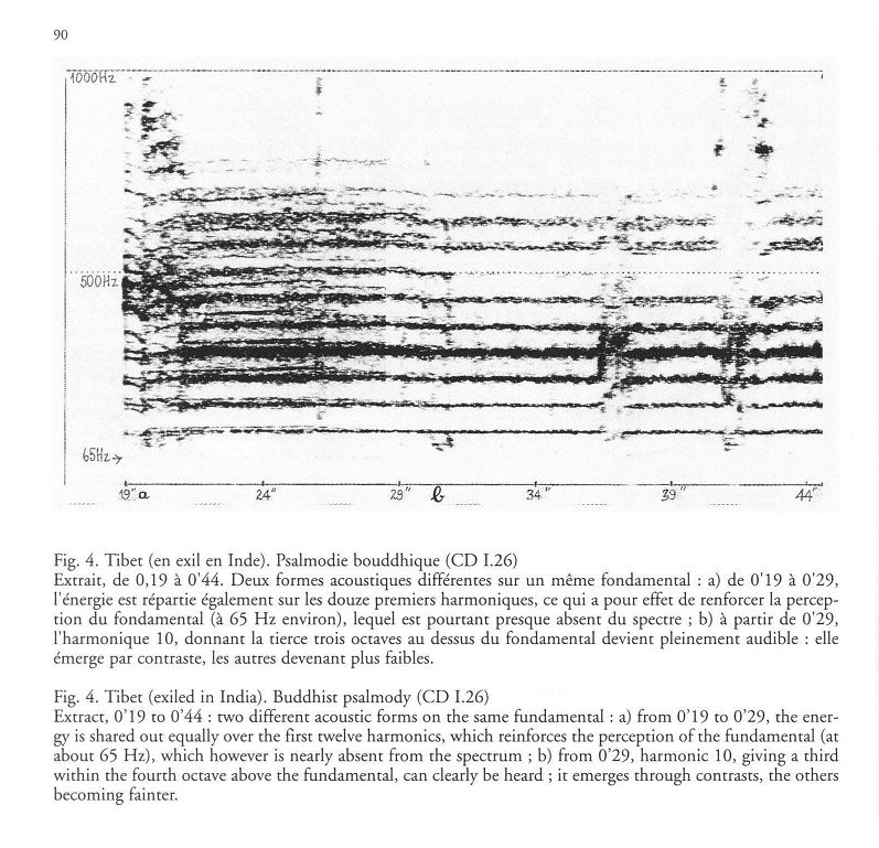 Ensemble of male voices, alternating syllabic recitation and the use of a specific vocal technique called "the roaring voice of the God of Death" (Gshin-rje'i ngarskad), or more commonly "the voice of mdzo (mdzo-skad), the mdzo bein a hybrid animal, the cross of a buffalo with a cow. The very low voices aid the emergence of harmonic 10 (three octaves plus a third above the fundamental), an effect which is systematically sought by the monks, especially "the song-master" (dbu-mdad), notably in the monasteries of the Dge-lugspa school, to which the College belongs. See the sonagram, figure 4."