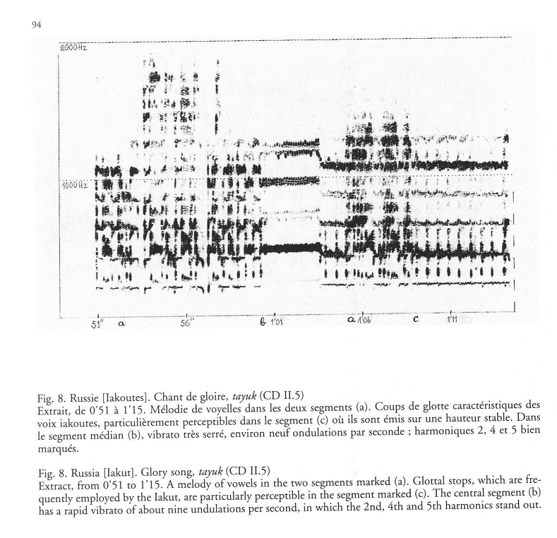 The singer of the tayuk learns as from infancy, through a near relative, to use diverse vocal emissions such as the glottal stop and the laryngeal tremulation (kolerach), and rapid vibrato. See the sonagram, figure 8.