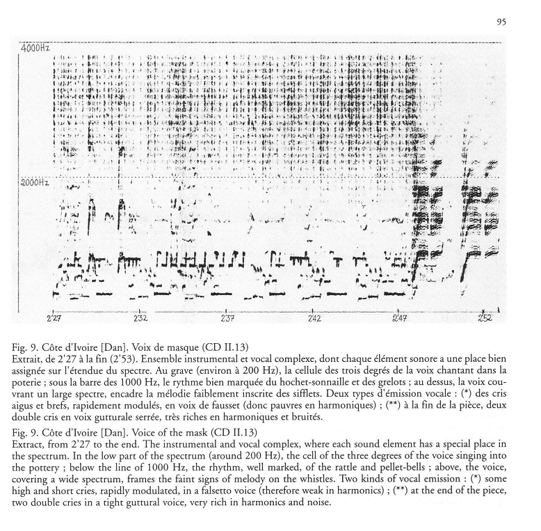 This mask expresses itself through the sound of sacred instruments : three stone whistles and an earthenware pot in which a fourth musician blows and sings. This pot serves as amplier and resonator. A fifth man sings in a tightly guttural voice (fry, at 0'37 and 0'47), characteristic of this type of mask. The accompaniment is produced by profane musical instruments (rattle and pellet-bells of white-iron). See the sonagram, fig.9.