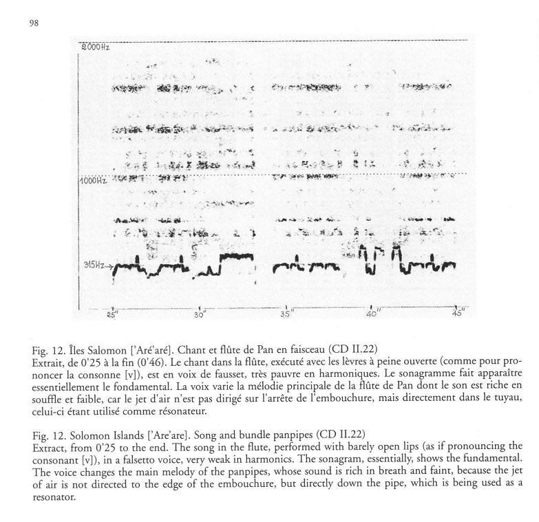 The musician sings in falsetto and slightly varies the melody that be simultaneously plays on an instrument made of seven tubes of bamboo open at both ends. See the sonagram, figure 12.