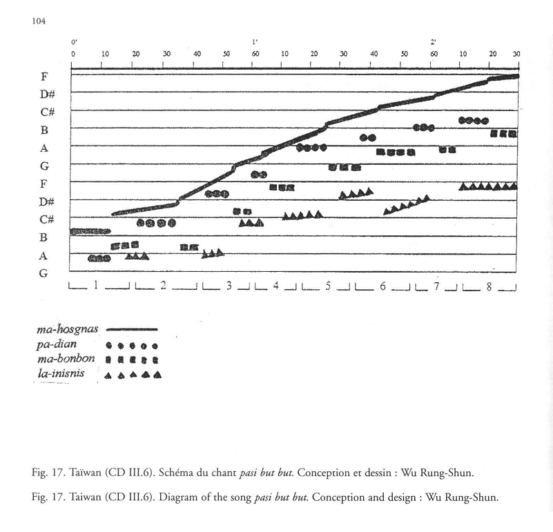 Le pasi but but des aborigènes Bunun représente une forme musicale unique, associant mouvements mélodiques en glissando et entrée des voix par paliers successifs. Il nécessite au minimum la participation de six chanteurs adultes, avec un meneur qui est chamane (lisigadan lusan). Dans cet enregistrement, il y a huit chanteurs se répartissant les quatre parties de la polyphonie selon la tessiture et le timbre de leurs voix (du haut en bas) : ma-hosgnas chantée par trois hommes, ba-tien par un seul, ma-bonbon et la-inisnis chacune par deux chanteurs. Selon les différentes versions du pasi but but, les intervalles sont variables, mais l'organisation des parties obéit toujours au même principe. Les entrées successives des quatre voix forment une cellule cyclique, répétée huit fois dans cette pièce. A la fin de la deuxième voix, la première voix monte environ d'un demi-ton ; la différence de hauteur entre le début et la fin du chant est ici d'une dixième (octave plus une tierce majeure). Cf. le schéma fig. 17.