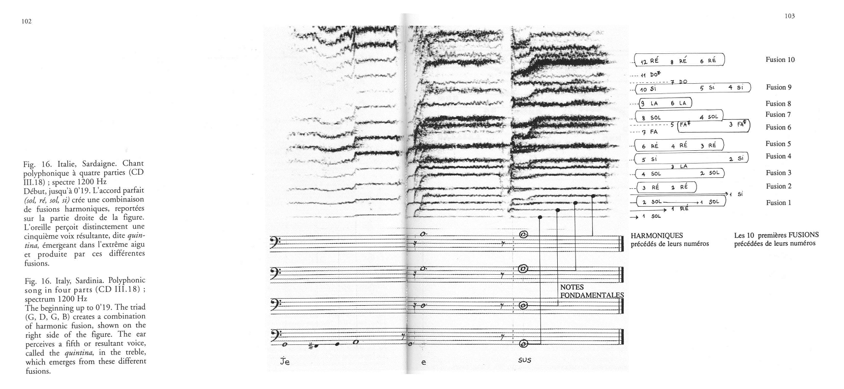 Four men. Technique of faislobordone based on the major triad and parallel isorhythmic parts for four voices (bassu, contra, bogi, falzittu). A plurimodal system with abrupt modulations. The timbre of each voice is especially chosen so that their harmonics combine and reinforce one another to produce a "fusional" voice, called the quintina, an octave above the bogi, as shown in the sonagram, figure 16.