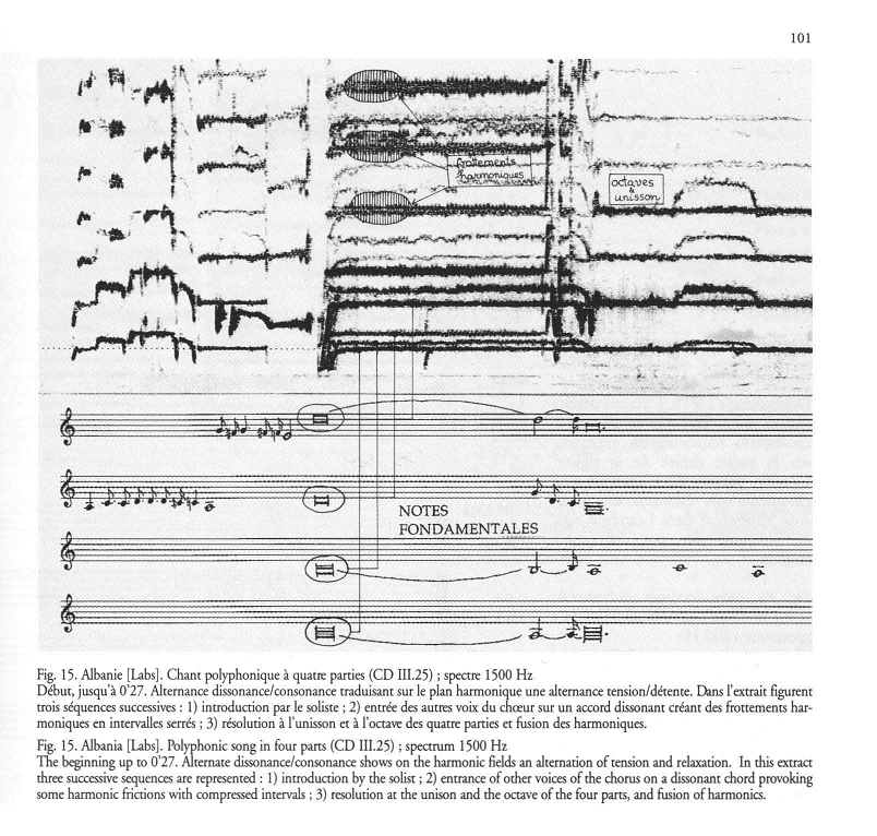Four arts : 1) marresi (literally "the one who tailles") ; 2) ktbyesi ("the one who returns"), entering after the marrësi at a second lower on the vowels [É] or [o] in falsetto ; 3) the kaba, a drone always performed by several singers ; 4) hedhèsi ("the one who restarts"), solo voice beginning mainly at the upper minor third above the kaba. The arts with texts, sung by the marrësi, are prolonged by dissonances at the second, coming to a unison at the end of a strophe. See the sonagram, figure 15.