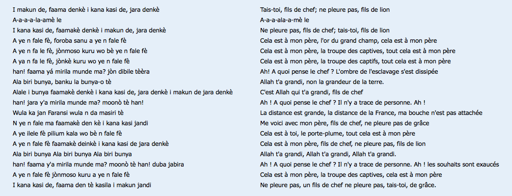 - La berceuse que chante ici Kondé Kouyaté appartient, elle aussi, au répertoire des louanges. Chantée à pleine voix, exempte de ce mouvement régulier souvent considéré comme la caractéristique du genre, cette berceuse n'a pas pour objet d'endormir l'enfant, mais de calmer ses pleurs par la vertu même de la louange. « Ne pleure pas ! A quoi pense le fils du chef ? l'ombre de l'esclavage est dissipée ! », est une des phrases qui reviennent le plus fréquemment.