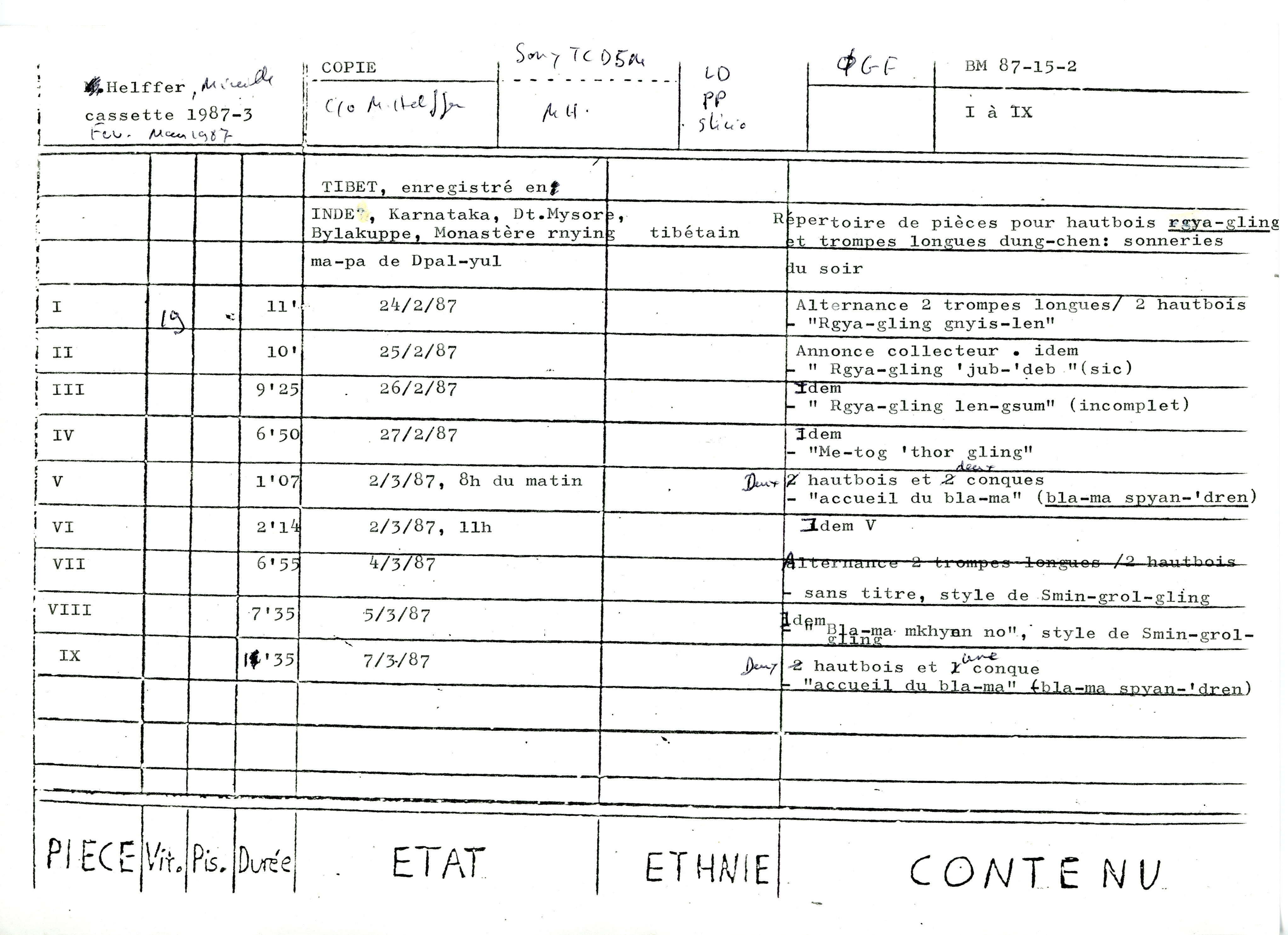 - Tibet, musique instrumentale et rituelle de monastères ; mission 1987