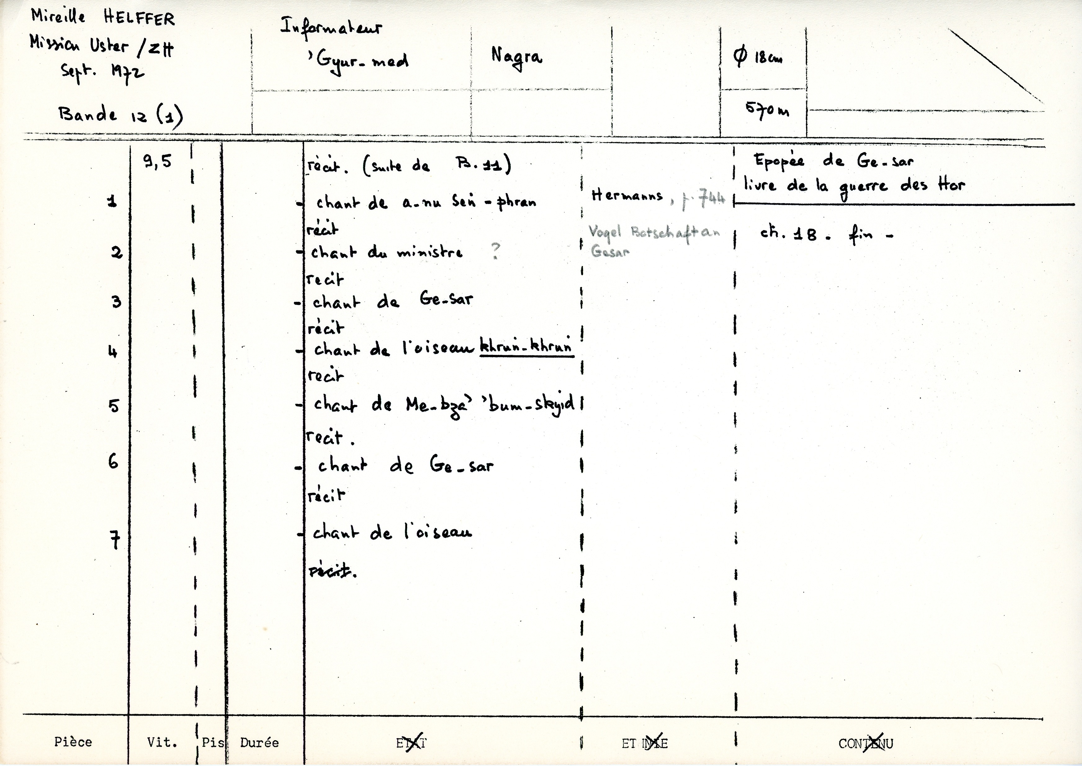 - Pour les noms de personnages et les noms d'airs: cf. la thèse de M. Helffer, " Les chants dans l'épopée tibétaine de Ge-sar"