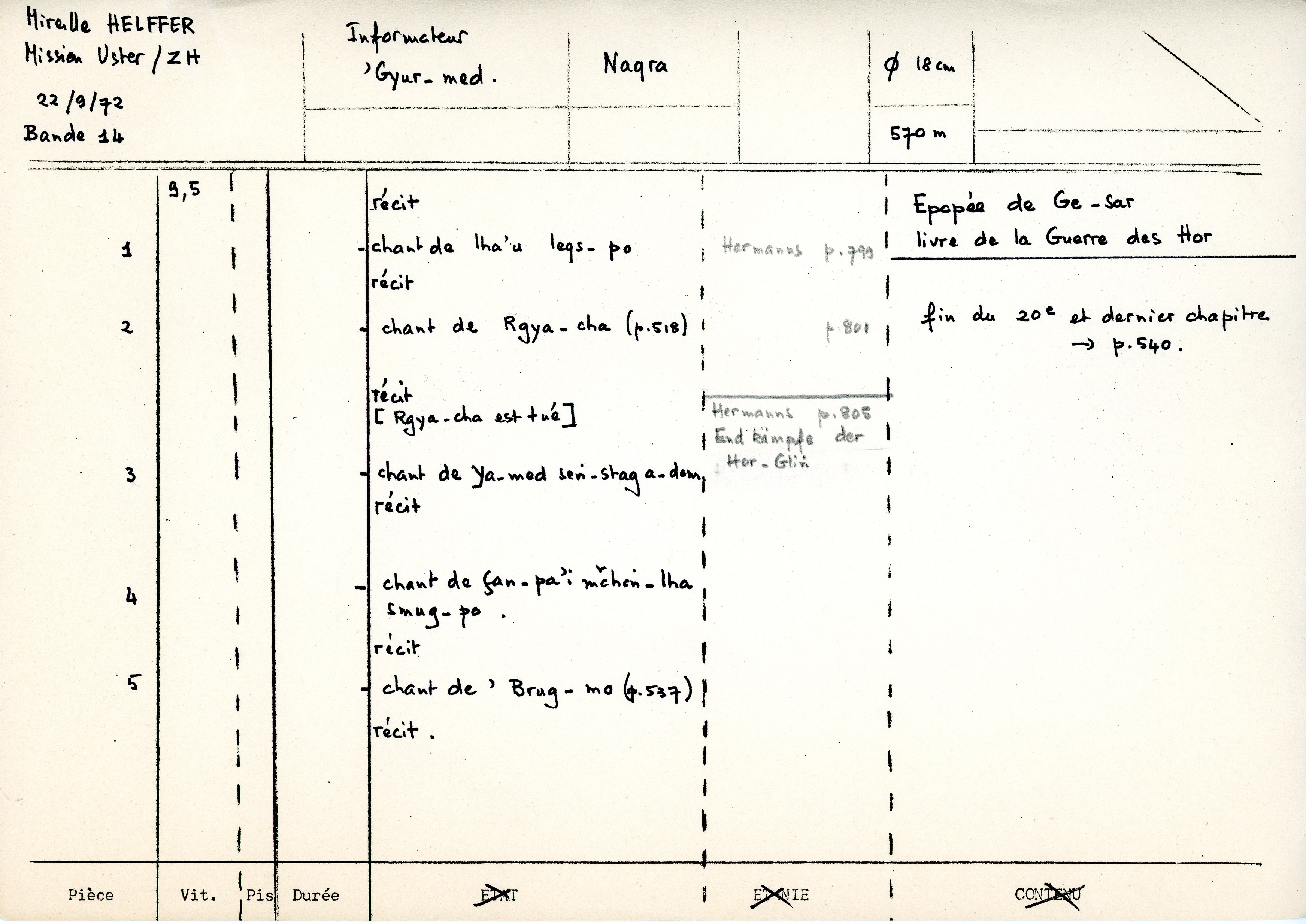 - Pour les noms de personnages et les noms d'airs: cf. la thèse de M. Helffer, " Les chants dans l'épopée tibétaine de Ge-sar"