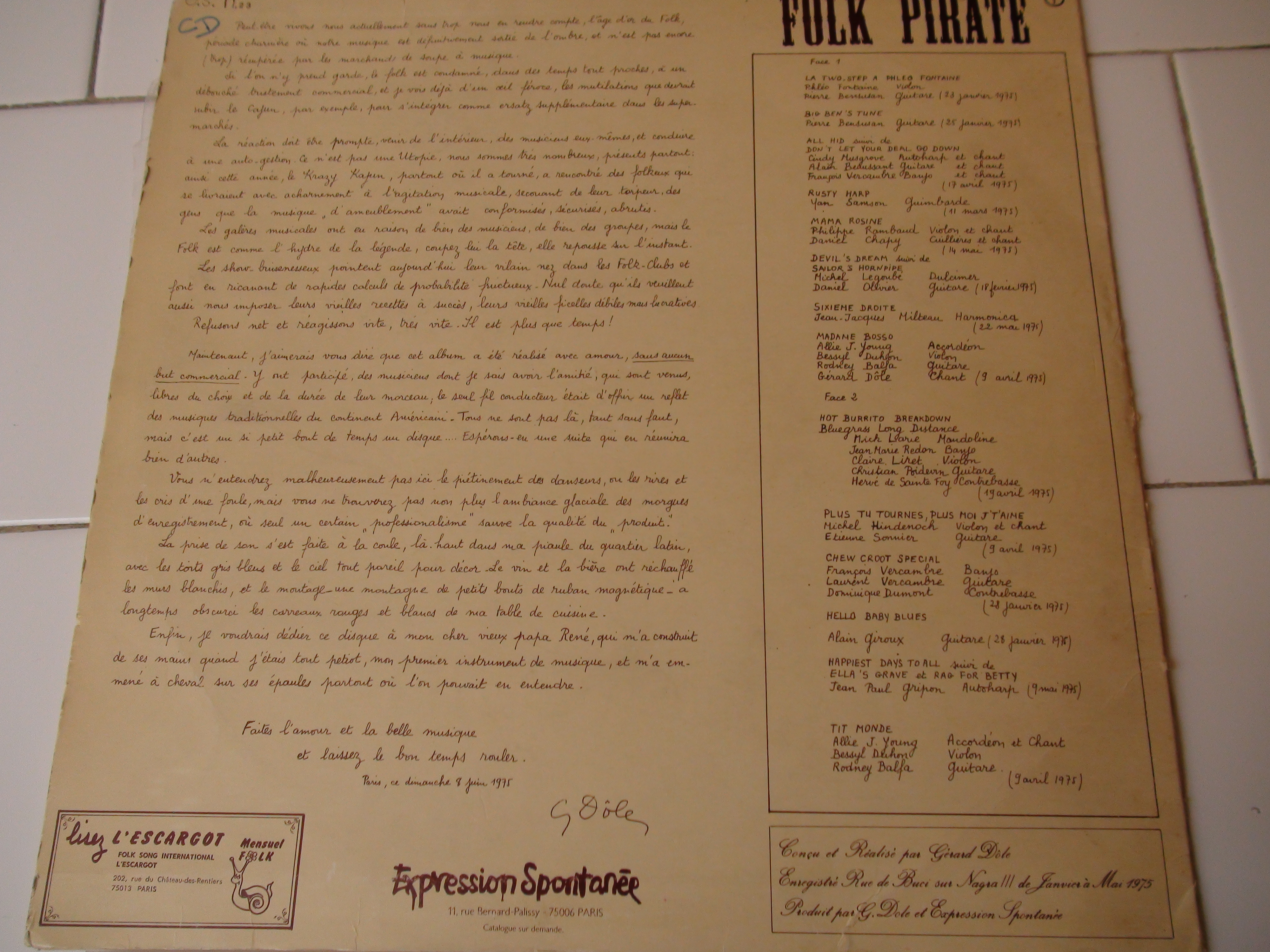 - (1)1975, Folk Pirate, Gérard Dôle (conception et réalisation),Expression Spontanée, ES 23, 33T, Paris